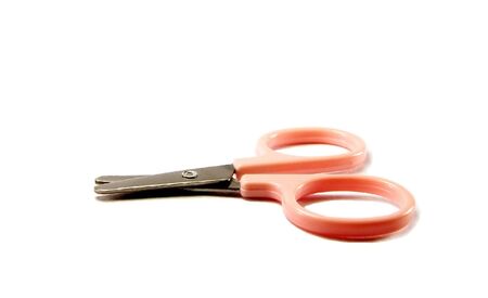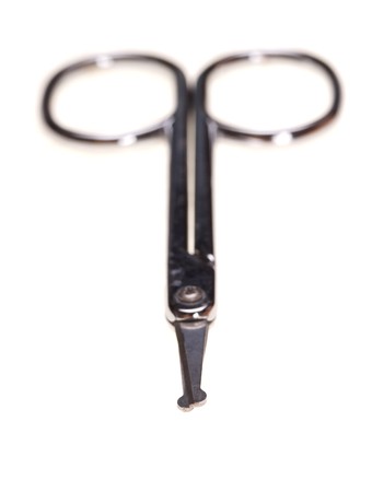 Small manicure scissors isolated on the white. Narrow depth of field. Old and used.