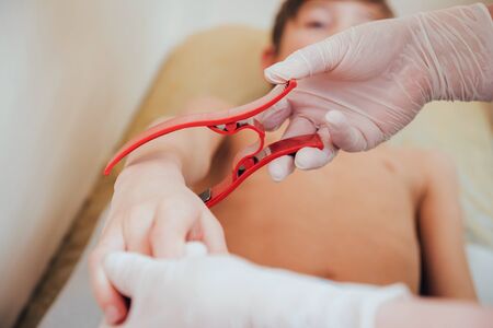 The doctor holds a surgical clamp in his hand. Nurse with a medical clip with scissors in her hand, studio background