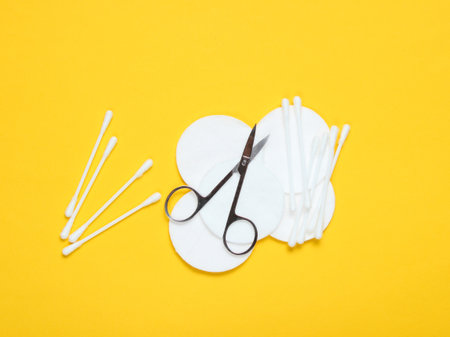 Flat lay style hygienic manicure products on yellowl background. Cotton pads, cotton buds, nail scissors. Top view