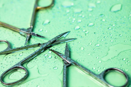 Sharp titanium manicure scissors for trimming cuticles on green background with water drops flatly with copy space. Metal tools for work of manicurist in beauty salon. Nail pedicure, body care concept