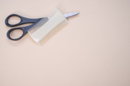 A closeup shot of scissors and hair comb on a beige surface - copy space