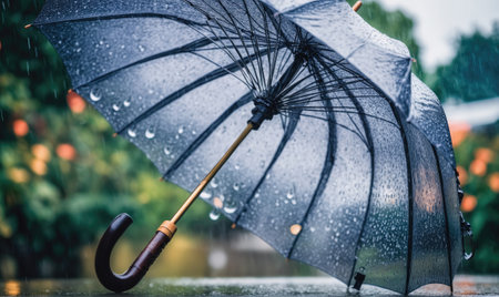 Opened black umbrella in a rainy weather. Raindrops close up. AI generative