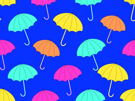 Colorful umbrellas on a blue background. Bright autumn pattern of umbrellas. Rain umbrellas. Design for printing, wrapping and fabric. Vector illustration