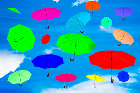 Colored umbrellas on the sky background