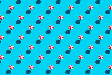 Beach umbrellas parasols on blue background pattern. Beach vacation concept