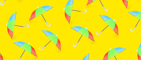 Many rainbow umbrellas on yellow background. Pattern for design