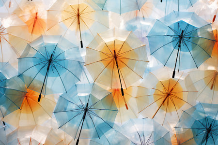 This image showcases an overhead view of various brightly colored umbrellas, artistically arranged to create a vibrant and visually appealing pattern, highlighting diverse colors and geometry. AI generated image