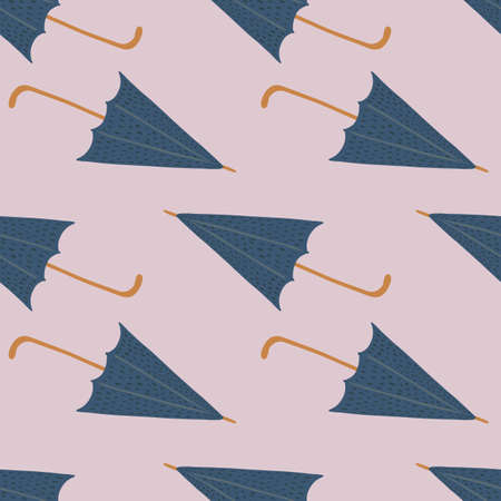 Navy blue doodle umbrella ornament seamless pattern. Light lilac background. Decorative backdrop for fabric design, textile print, wrapping, cover. Vector illustration.