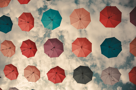 Colorful opened umbrelas hanging above the street on the sky background.