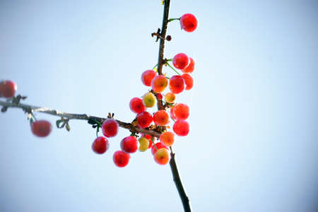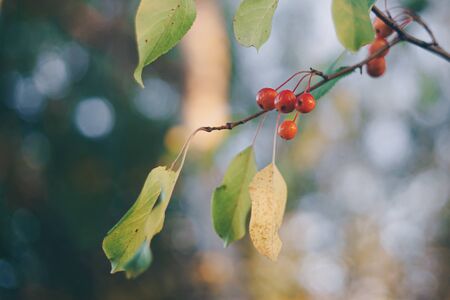 Autumn photo. Small red decorative apples on a tree in a park
