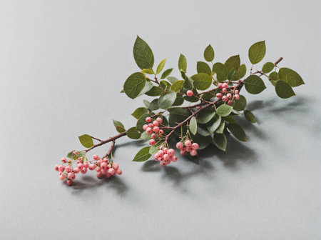 A stunning display of bright red berries on a slender branch against a smooth white background, perfect for showcasing nature