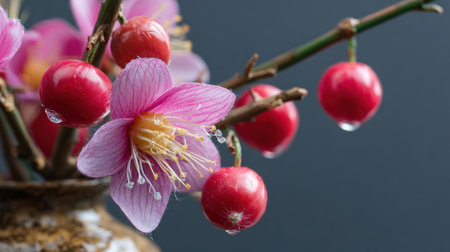 A macro shot presents a delicate pink flower and vibrant red berries attached to a branch. The composition is set against a soft, blurred background, highlighting the textures and colors of the natural elements. This image is suitable for various commercial uses, including artistic designs and decorative projects.
