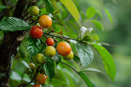 Close-up of colorful coffee cherries at various stages of ripeness on a tree, with a blurred green background