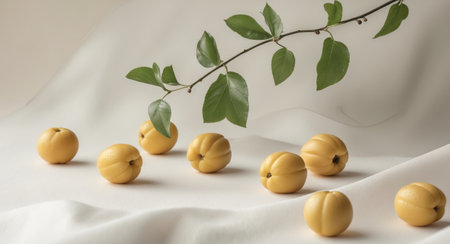 AI Generated. Tiny Golden Loquats with Green Leaves on a Neutral Background for Upscale Presentation