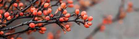 Close-up of vibrant coral-colored berries on a dark branch, showing autumnal colors and textures.