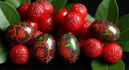 A striking arrangement of colorful miniature fruits displayed on a dark plate, showcasing a variety of glossy textures and vibrant tones perfect for food photography.