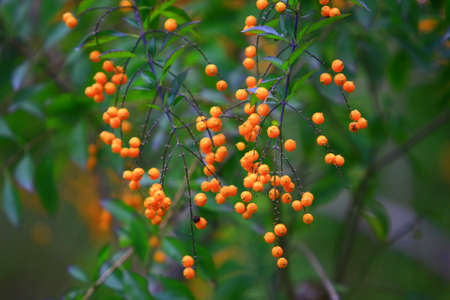 Beautiful panoramic autumn scenery with colorful leaves, berries and bokeh background