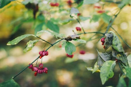 Beautiful pink berries on branch in autumn woods. Spindle. Euonymus europaeus. Poison ripe berries with green leaves on bush in forest