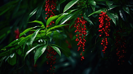 A bunch of red berries are hanging from a tree, AI