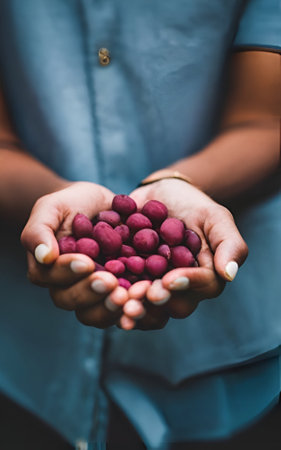 Close-up of female hands holding a handful of red beans.
