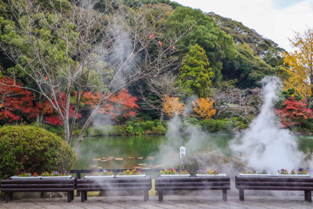 Oniishibozu Jigoku (Ghost Rock Monk Hell) pond in autumn, which is one of the famous natural hot springs viewpoint, representing the various hells in Beppu, the Japanese means