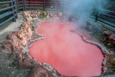 Beppu, Oita, Japan, November 8, 2018: Chinoike Jigoku (Blood Pond Hell) pond in autumn, which is one of the famous natural hot springs viewpoint, representing the various hells in Beppu