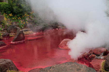 Red hot spring near UMI JIGOKU (Sea Hell) pond in autumn, which is one of the famous natural hot springs viewpoint, the japanese in picture means