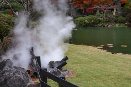 Beppu, Oita, Japan, November 8, 2018: Kamado Jigoku (Cooker Hell) pond in autumn, which is one of the famous natural hot springs viewpoint, representing the various hells in Beppu