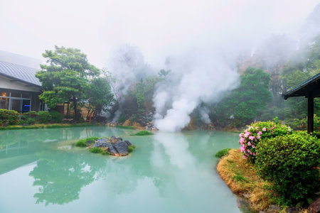 Beppu, Oita, Japan - December 6, 2022 : Sea hell Umi Jigoku hot springs garden