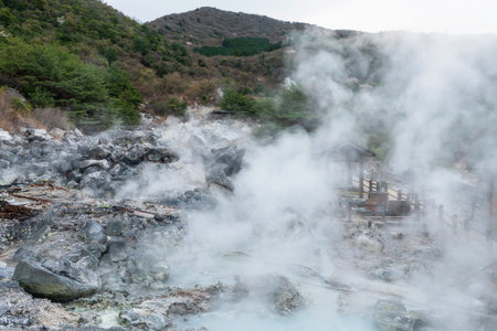 Jigoku of Mount Unzen onsen hot springs with heavy sulfur gas in early morning, Nagasaki, Kyushu, Japan. Hot water, gas and steam spout out of the earth.