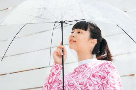Young asian woman in pink shirt holding transparent umbrella in rainy day.