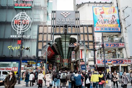 Tourists walking in Shinsaibashi street near Namba, Osaka, the city's main shopping area, that is north of Dotonbori street. landmark and popular for tourists attractions.Osaka, Japan, 1 December 2019