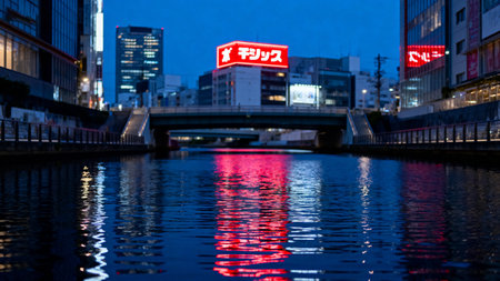 This image presents a stunning night-time cityscape bathed in neon lights, with reflections on streets creating a futuristic atmosphere. Resplendent.
