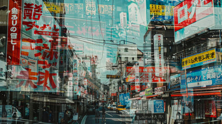A busy city street with many signs and advertisements. The signs are in a foreign language, and the overall mood of the image is bustling and lively