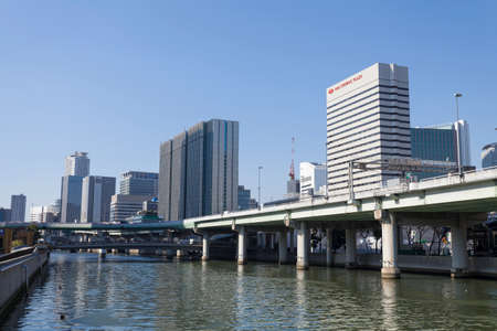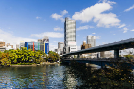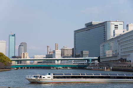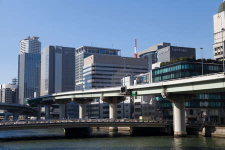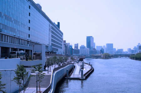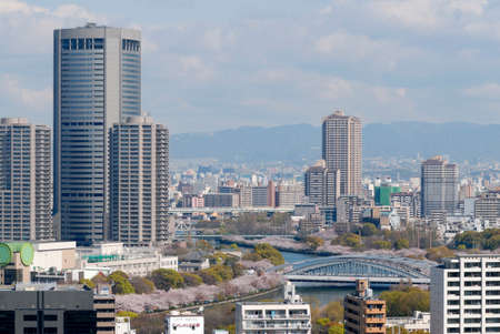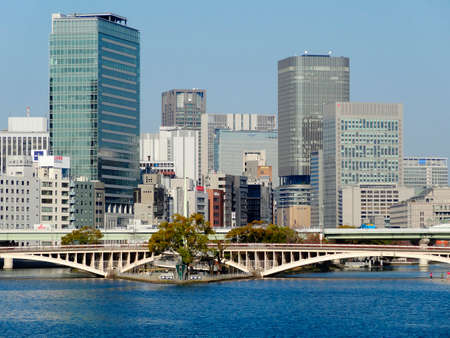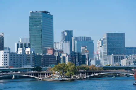 View of Osaka cityscape with Yodo River embankment and skyscrapers, Osaka prefecture, Japan, in a sunny day with a blue sky, streets of Osaka downtown center, travel to Japan