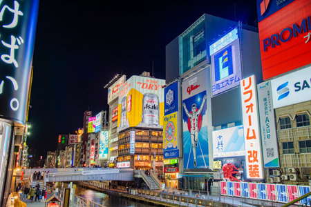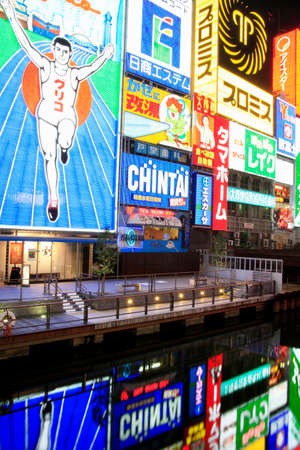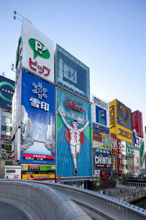 OSAKA, JAPAN - NOVEMBER 23, 2016 : The Glico Man billboard and other illuminated signboards in Dontonbori, Namba area, Osaka, Japan. Dotombori is popular nightlife and entertainment area in Osaka.