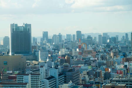 Osaka, Japan - november 09, 2019: Highrise cityscape crowded skyscrapers offices apartments Osaka Japan
