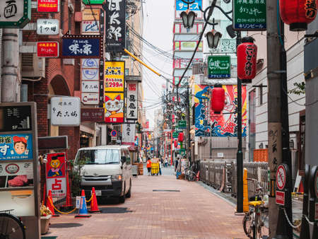 OSAKA, JAPAN - APR 17, 2017 : Bar restaurant street Colorful sign. Osaka city Shop business Japanese lifestyle