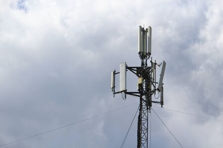 Cell tower against a cloudy sky. Base station of cellular operator