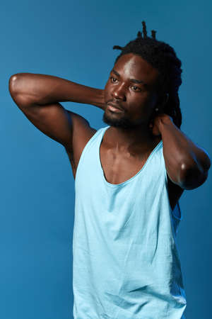 Handsome man in white t-shirt studio lifestyle blue background