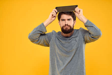 Bearded man with tablet in hands technology work wireless device yellow background