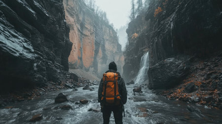 Alajuela, Costa Rica. Young and fearless hiker climbing the steep rock of the canyon in the rain.