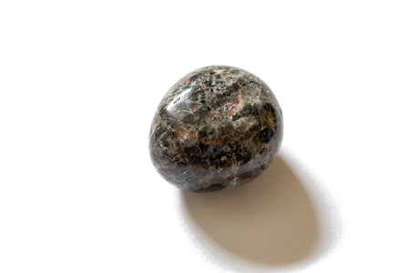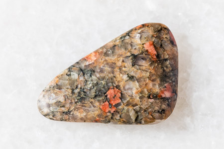 sample of tumbled gneissoid granite rock on white marble background close up from Karelia, Russia