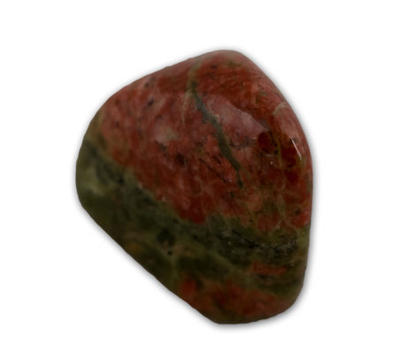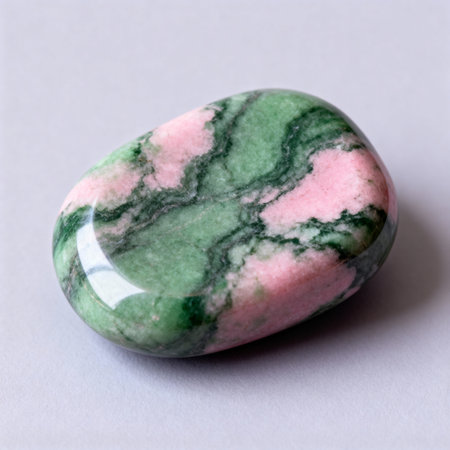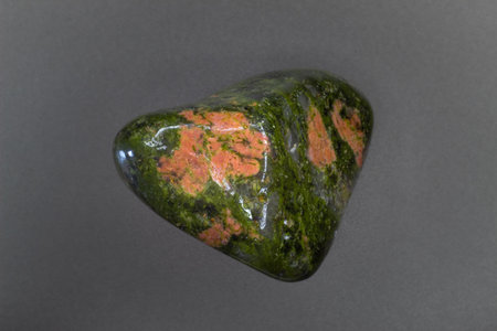 Polished green and pink unakite gemstone on gray background, showing unique crystal patterns and smooth natural surface texture.