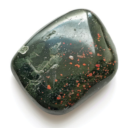 This polished dark green stone features striking red flecks, showcasing a smooth texture and unique patterns. Ideal for home decor, jewelry, or artistic projects.