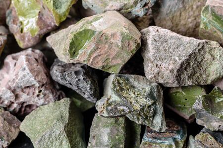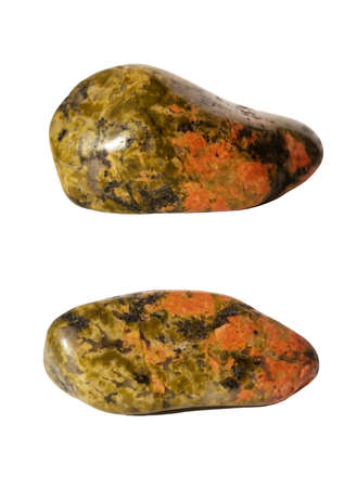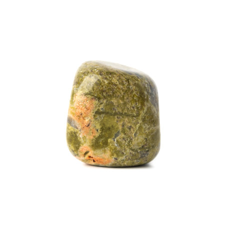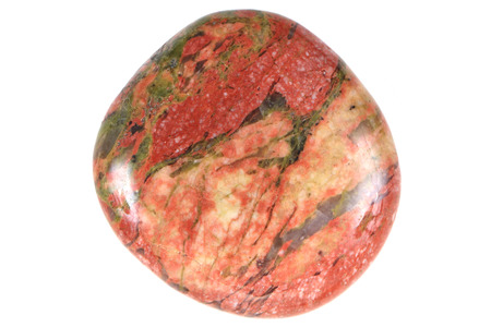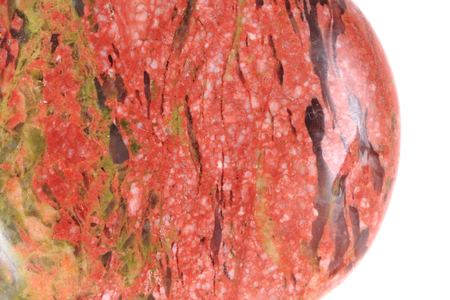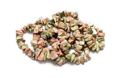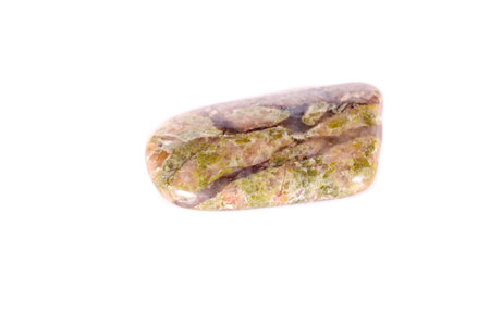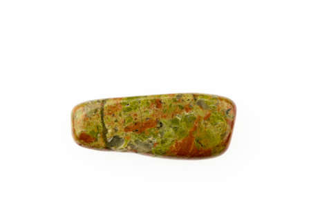 Mineral unakit on a white background. Epidositis, Unakit. Decorative and ornamental stone. Close up view. Jewelcrafting. Lithotherapy.