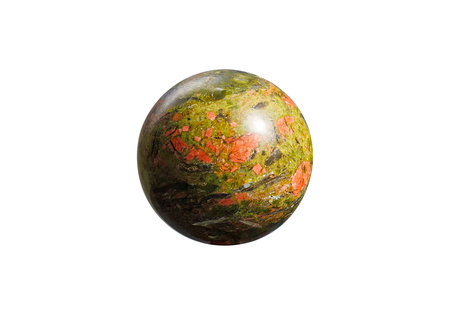A vibrant Unakite ball on an isolated white background, showing a mix of bright green and pink hues with a lustrous surface. Perfect for spiritual decor or gemstone displays.