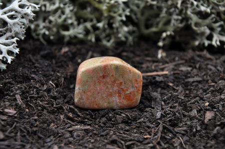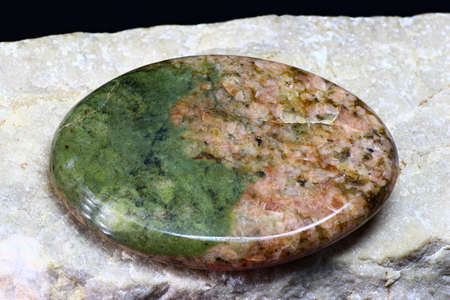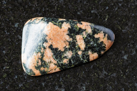 macro shooting of natural mineral rock specimen - polished Unakite gemstone on dark granite background