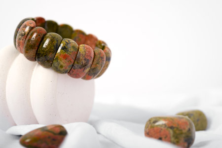 Natural unakite stone bracelet on isolated white background. Unisex. Isoteric