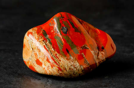 Stone mineral jasper on a black concrete background. The concept of using minerals and crystals in astrology and alternative or complementary medicine.